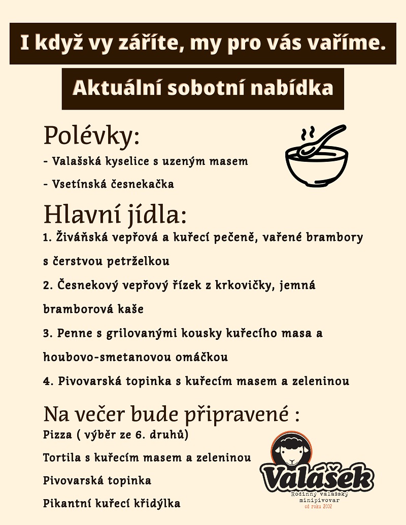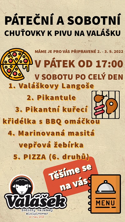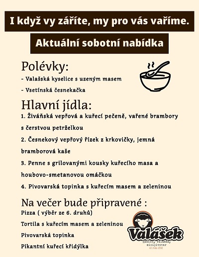 V sobotu 17.9.2022 vaříme pro vás obědová jídla od 11.30 . Od 17.00 hodin PIZZA - 6 druhů ,dále pečená masová žebírka, hovězí hamburger,nakládaní pikantní utopenci a Hermelíny,valašská kyselice a kulajda s houbami a další dobroty.Na čepu 6 druhů orosených piveček.Těšíme se na vaši návštěvu. |